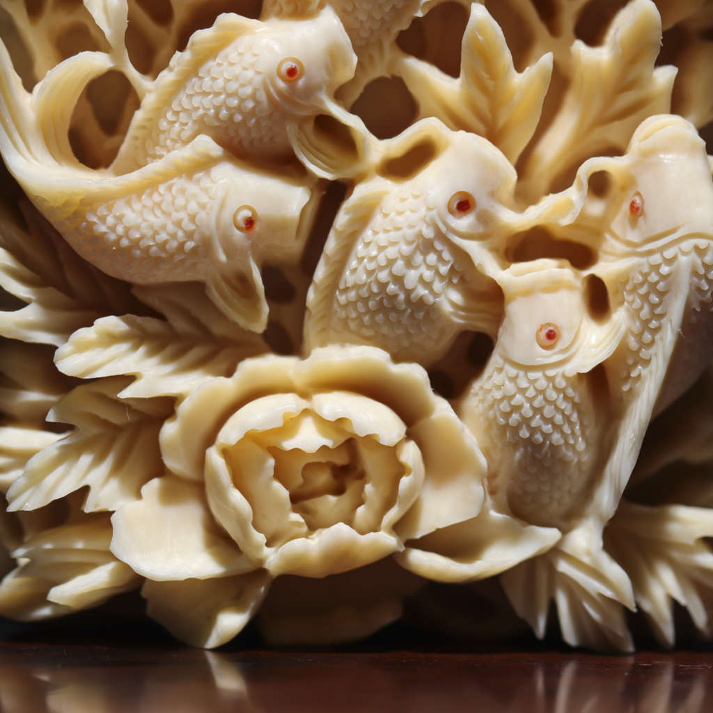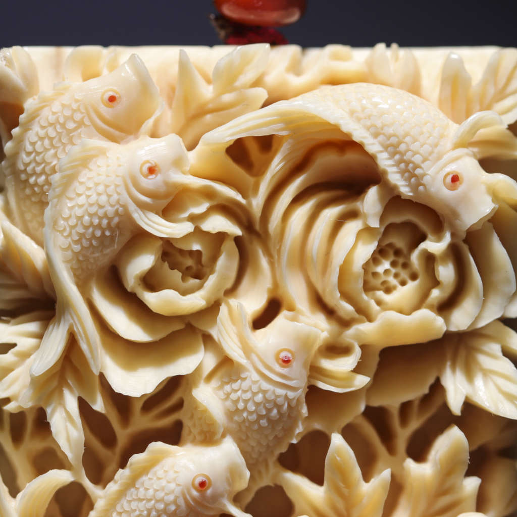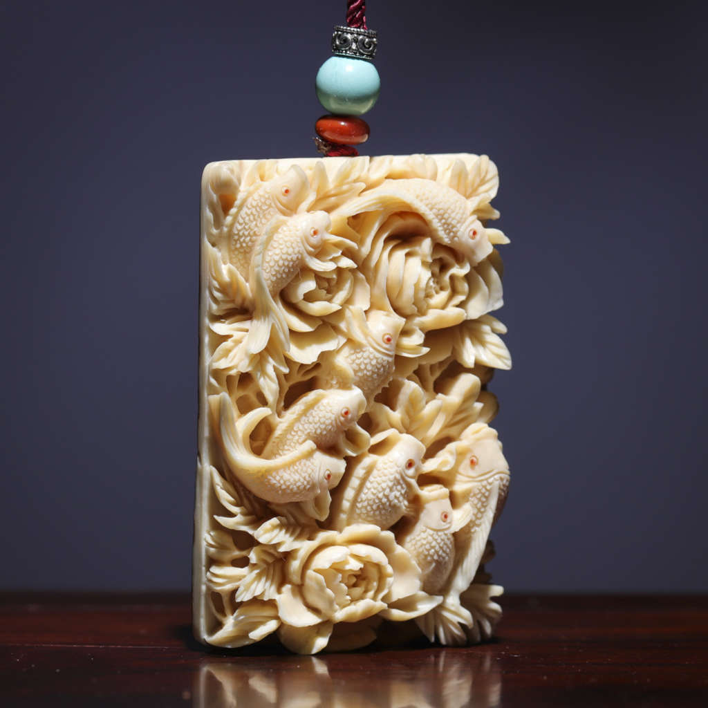 【猛犸牙雕作品】《九鲤富贵》,鲤鱼牡丹皆为吉祥富贵的象征,寓意招财进宝、富贵吉祥。同时亦有鲤鱼逆流前进、跃门化龙之说,寓意升官发财、飞黄腾达。精选猛犸带皮冰料!料子润泽,纹路清晰,老师傅纯手雕刻,细节完美!