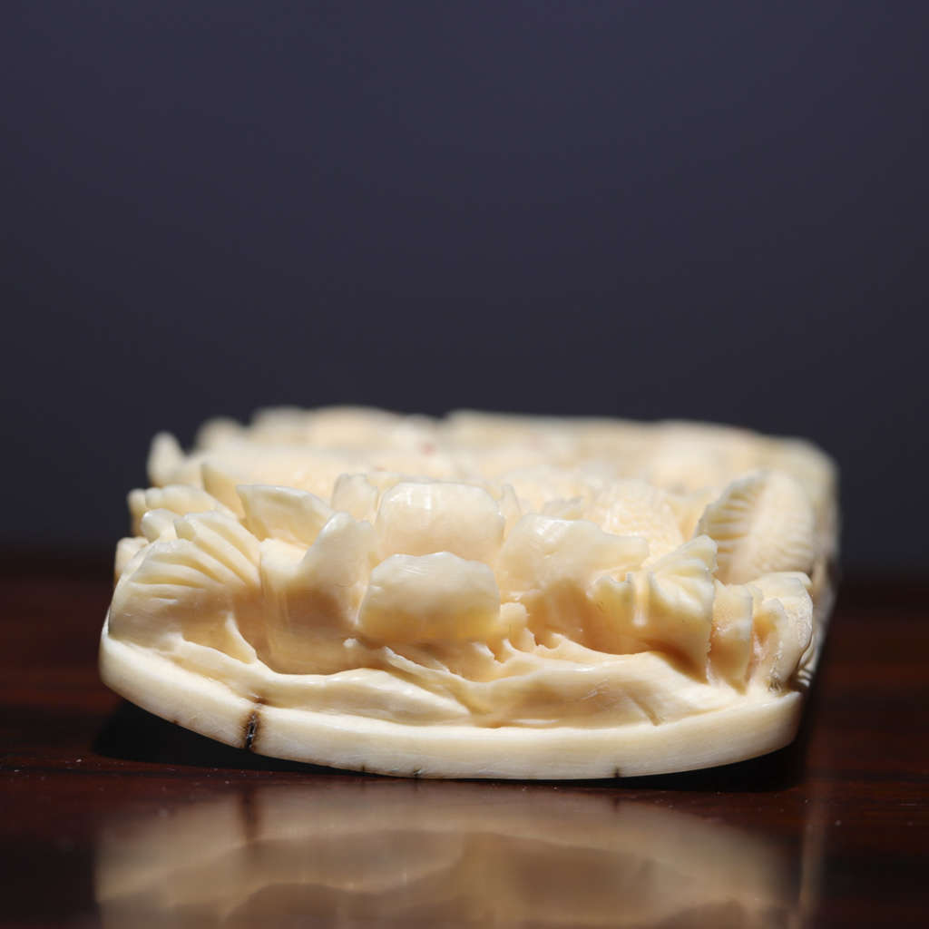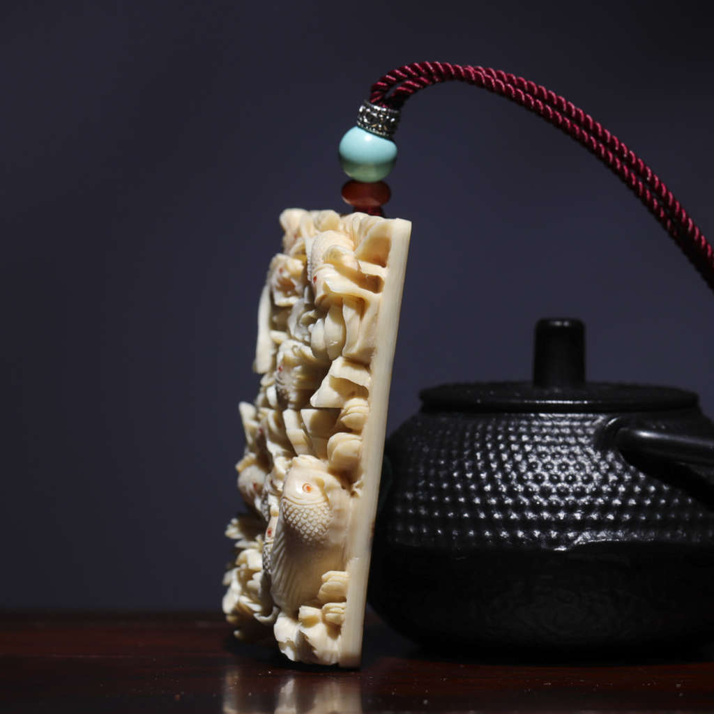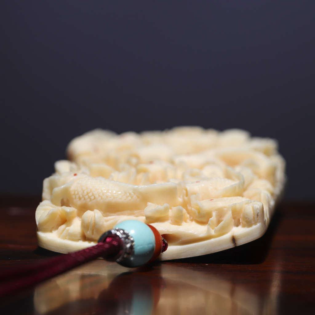 【猛犸牙雕作品】《九鲤富贵》,鲤鱼牡丹皆为吉祥富贵的象征,寓意招财进宝、富贵吉祥。同时亦有鲤鱼逆流前进、跃门化龙之说,寓意升官发财、飞黄腾达。精选猛犸带皮冰料!料子润泽,纹路清晰,老师傅纯手雕刻,细节完美!